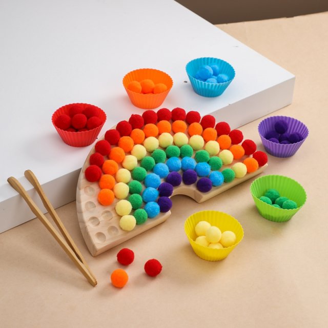 Make early education fun and engaging with this delightful Montessori-inspired Rainbow Pom Pom Sorting Game. Designed to develop fine motor skills, hand-eye coordination, and cognitive growth, this toy combines vibrant colors with hands-on play. With a set of rainbow-colored pompoms, a sturdy wooden board, and easy-to-use tweezers, children learn while they play—building essential skills that last a lifetime.