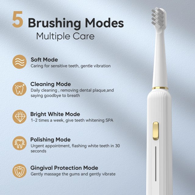 • Five Cleaning Modes: Deep cleaning, plaque removal, whitening, gentle cleaning, and massage mode for gum care.